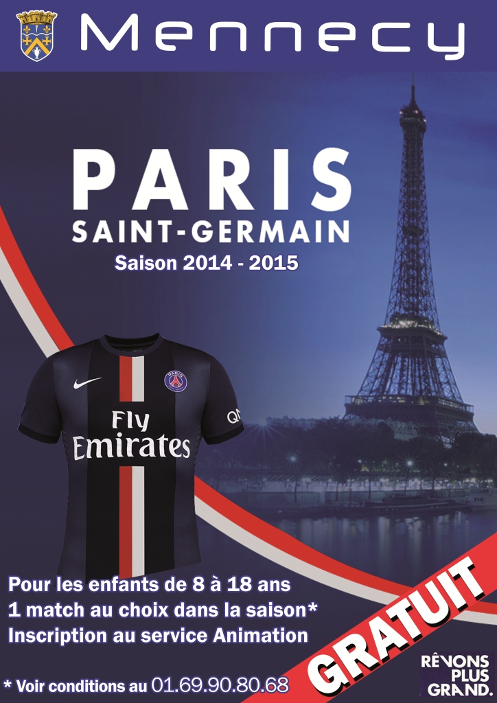 Paris Saint Germain Sorties gratuites pour les enfants Menneçois de 8 à 18 ans lors des matches au Parc de Princes. Informations et inscriptions au Service Animation Mairie Jacques Broz 31 rue de Milly et au 01.69.90.80.68